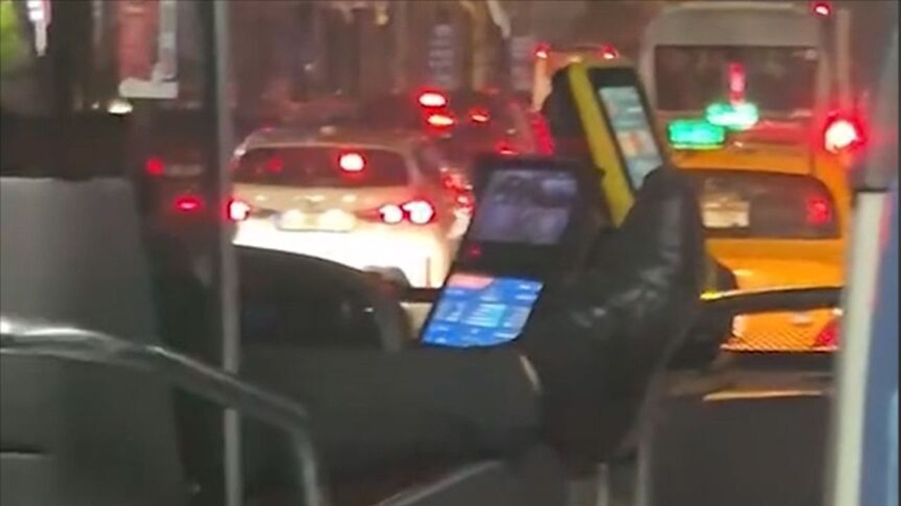 Seyir halindeki "622-Yenidoğan-Mecidiyeköy" seferini yapan otobüsün şoförü, sağ ayağını validatör cihazının bulunduğu bölüme uzattı.