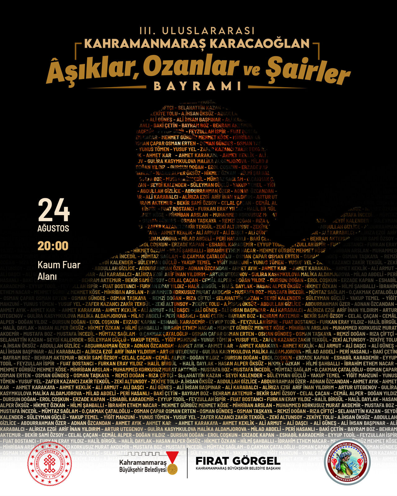 24 Ağustos Pazar günü KAFUM Fuar Alanı’nda saat 20.00’de başlayacak olan “3. Uluslararası Kahramanmaraş Karacaoğlan Âşıklar, Ozanlar ve Şairler Bayramı”, halk ozanlarını ve şairleri bir araya getirecek. Etkinlikte, Anadolu’nun farklı bölgelerinden kente gelen ozanlar sahne alarak bağlamanın ezgileri eşliğinde halk edebiyatının en güçlü örneklerini sunacak.