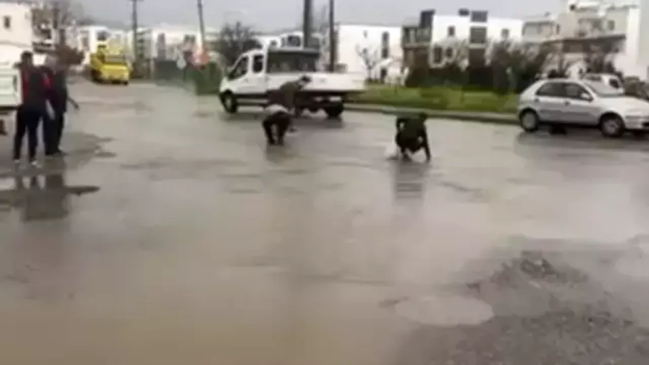 Muğla'nın Bodrum ilçesinde etkili olan sağanak yağış, Mumcular Mahallesi’ndeki Mustafa Kalem Parkı’ndaki göletin taşmasına neden oldu. Taşan sularla birlikte göletteki balıklar asfalta sürüklendi ve ortaya alışılmadık görüntüler çıktı.