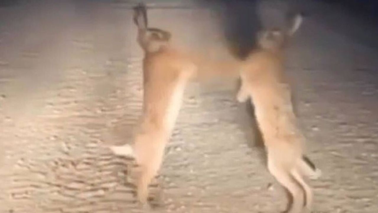 Görüntülerde, tavşanlardan birinin aldığı darbeler sonrası kaçtığı, diğerinin ise peşinden kovaladığı görülüyor.