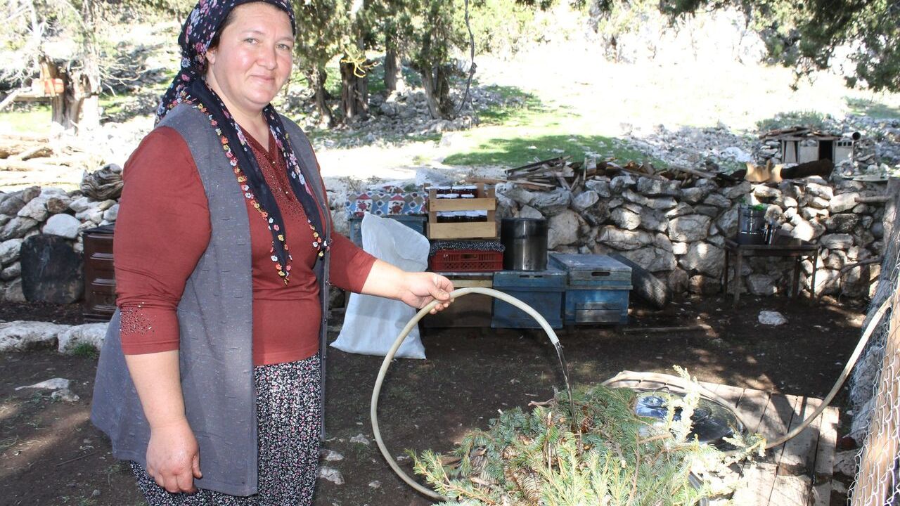 Aladağ ilçesinde pandemi ile sedir kozalağı şurubu üretimine başlayan Beyhan Tuğ, öksürük ve astım rahatsızlığının iyileşmesiyle başladığı sedir kozalağı şurubunu hem sağlığı için tüketiyor, hem de talep oldukça satarak evine ek gelir sağlıyor.