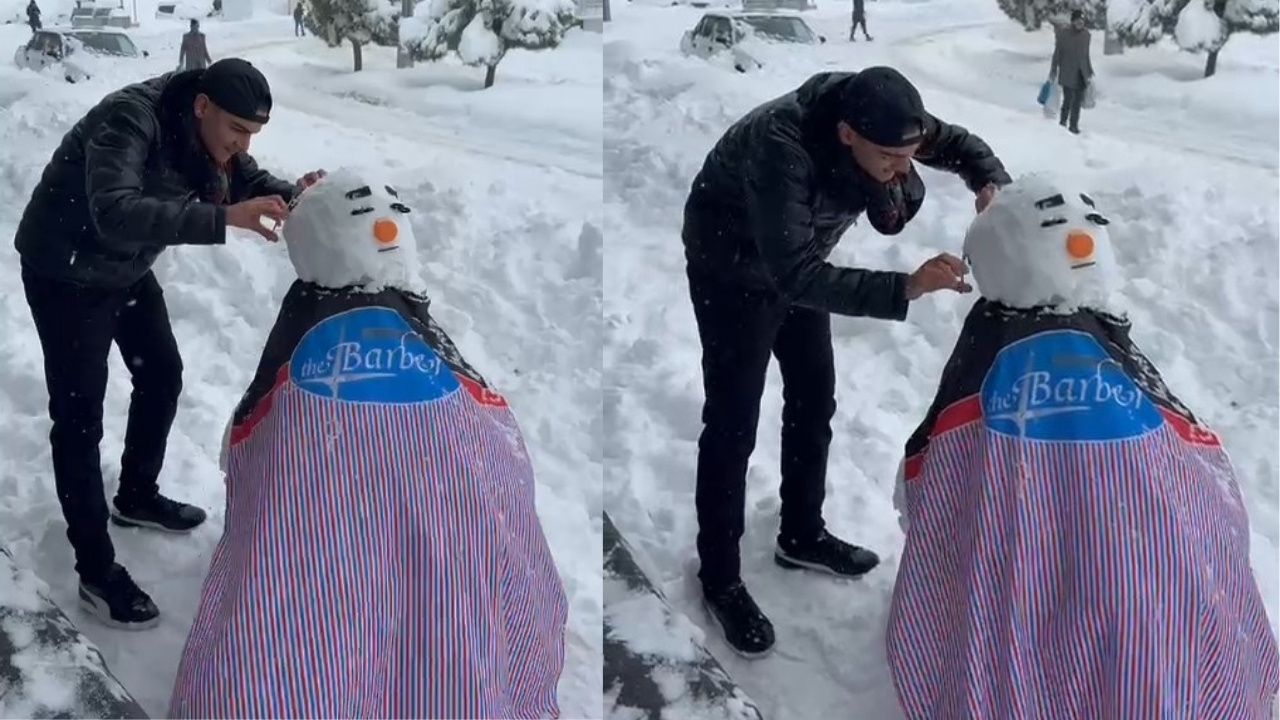 Kar yağışının etkisiyle sokaklar beyaza bürünürken, Halil Atak iş yerinin önünde büyük bir kardan adam yapmayı tercih etti. Ardından, kardan adamı mesleğine uygun bir şekilde tıraş etmeye başlayan Atak, makas ve tarakla tıraş yaptığı kardan adamla çevresindekileri güldürdü. Kuaförün, kardan adamı tıraş ederken giydiği peştemal de çevredekilerin dikkatini çekti.