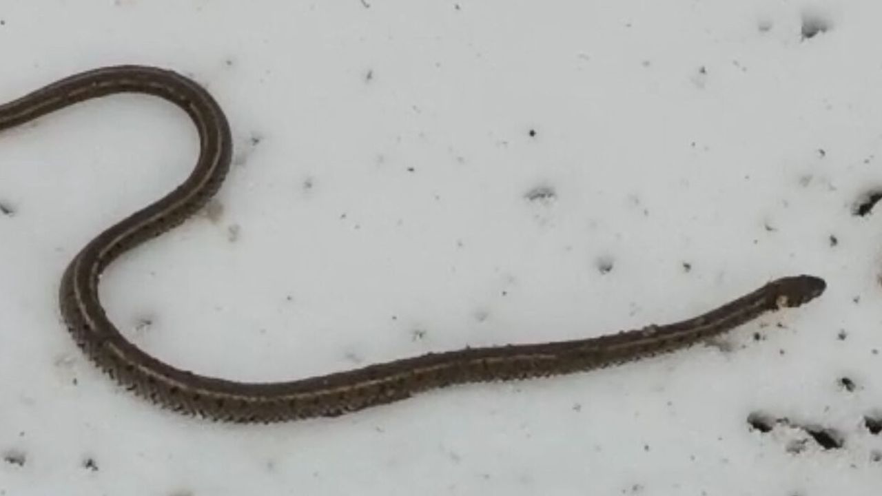 Kar üzerinde bir süre gezinen yılan, daha sonra gözden kayboldu.