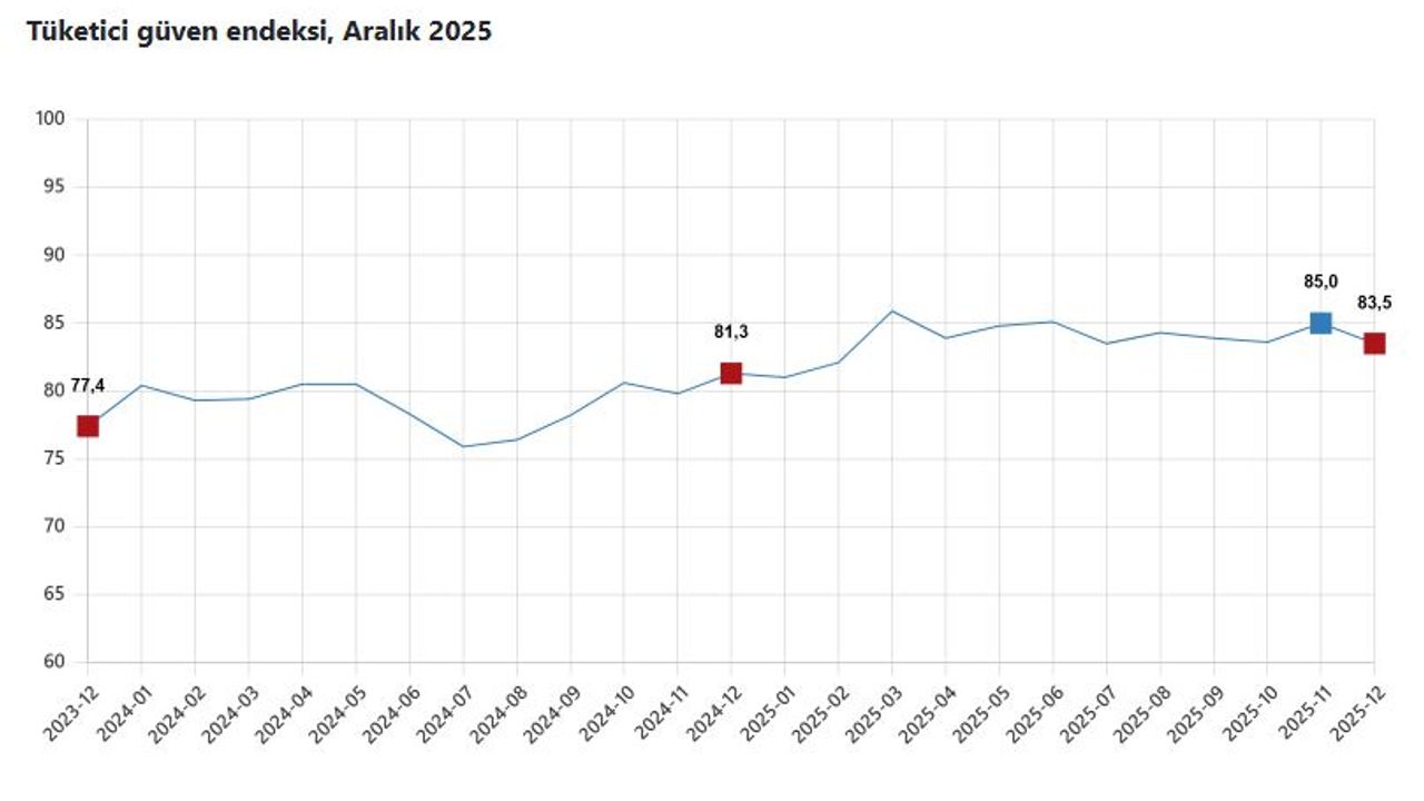 Türkiye İstatistik Kurumu (TÜİK) Aralık 2025 dönemi tüketici güven endeksi verilerini açıkladı. Buna göre, tüketici güven endeksi bir önceki aya göre yüzde 1,8 düşerek 83,5 seviyesine geriledi.