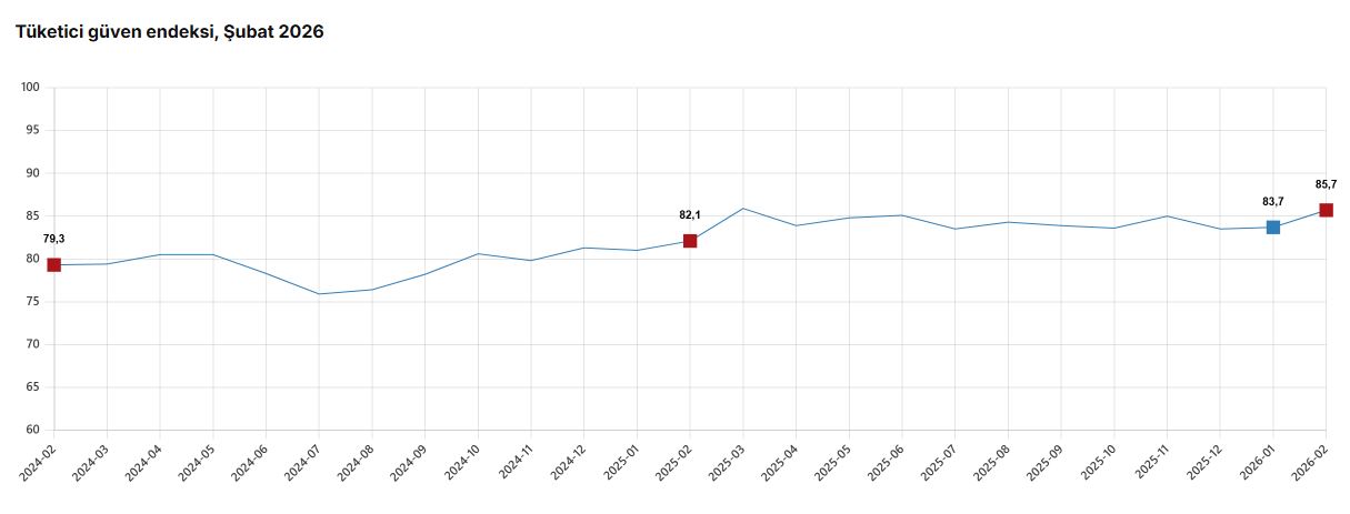 Türkiye İstatistik Kurumu (TÜİK), Şubat 2026 dönemine ilişkin tüketici güven endeksi verilerini açıkladı. Tüketici güven endeksi, Şubat ayında bir önceki aya göre yüzde 2,3 oranında artarak 85,7 oldu. Bu artış, tüketicilerin ekonomik durum ve geleceğe yönelik beklentilerinde olumlu bir değişime işaret ediyor.