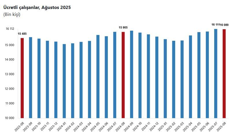 TÜİK, Ağustos 2025 dönemine ilişkin ücretli çalışan istatistiklerini açıkladı. Buna göre; sanayi, inşaat ve ticaret-hizmet sektörleri toplamında ücretli çalışan sayısı 2025 Ağustos ayında bir önceki yılın aynı ayına göre yüzde 1,2 arttı. Ücretli çalışan sayısı bir önceki yılın aynı ayında 15 milyon 904 bin 602 kişi iken, 2025 yılı Ağustos ayında 16 milyon 89 bin 450 kişi oldu. Ücretli çalışanların alt detaylarına bakıldığında; 2025 Ağustos ayında ücretli çalışan sayısı yıllık olarak sanayi sektöründe yüzde 3,6 azaldı, inşaat sektöründe yüzde 7,2 arttı ve ticaret-hizmet sektöründe yüzde 2,6 arttı.