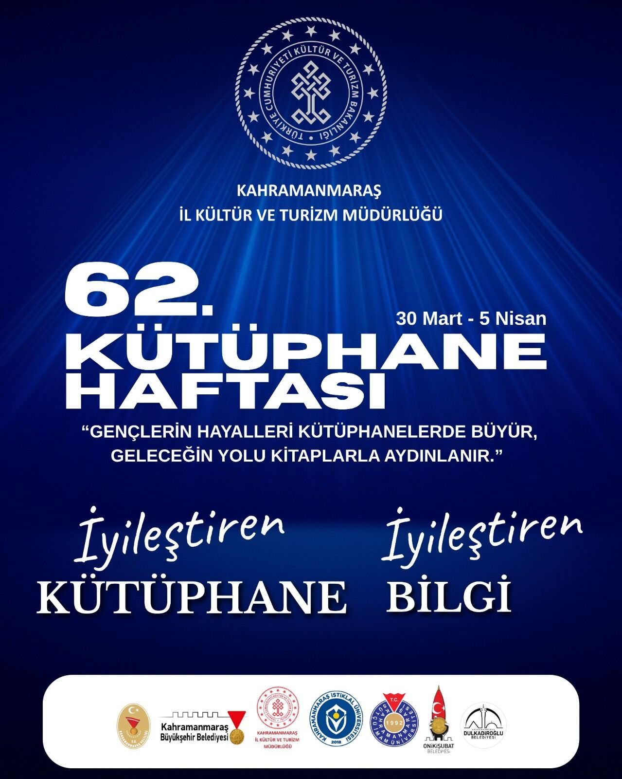 Kültür ve Turizm Bakanlığı’nın her yıl ülke genelinde kutladığı Kütüphane Haftası’nın 62. durağı, Kahramanmaraş’ta eşine az rastlanır bir coşkuyla kutlanmaya hazırlanıyor. 26 Mart 2026 tarihinde yapılan duyuruya göre, bu yılki kutlamalar 30 Mart - 05 Nisan 2026 tarihleri arasında gerçekleştirilecek.