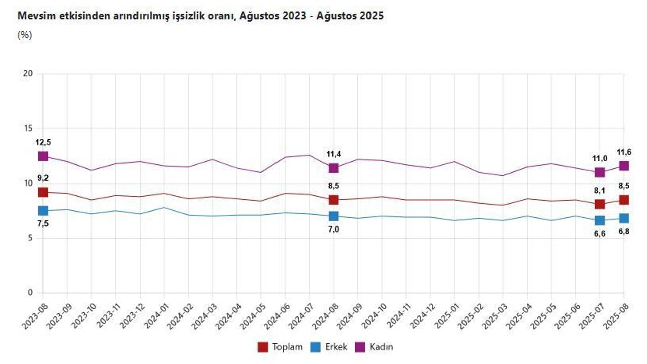 Türkiye İstatistik Kurumu (TÜİK), 2025 yılı ağustos ayına ilişkin iş gücü istatistiklerini kamuoyuyla paylaştı. Verilere göre, işsizlik oranı bir önceki aya kıyasla 0,4 puan artış göstererek yüzde 8,5 seviyesine çıktı. İşsiz sayısı ise ağustos ayında 168 bin kişi artarak 3 milyon 44 bine ulaştı.