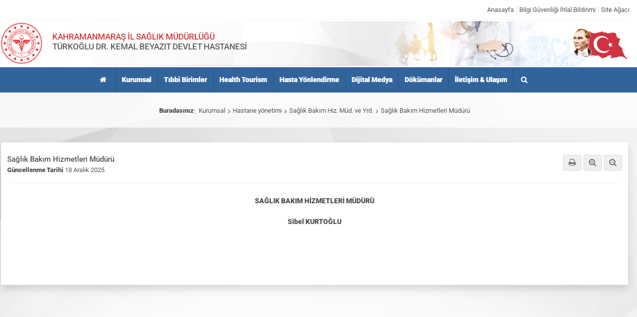 Kahramanmaraş’ın Türkoğlu ilçesinde hizmet veren Türkoğlu Devlet Hastanesi’nde yönetim kadrosunda bir değişiklik yaşandı. Sağlık Bakım Hizmetleri Müdürü olarak görev yapan Nadir Bağcı’nın sözleşmesinin sona ermesiyle birlikte, göreve Sibel Kurtoğlu getirildi. Görev değişikliği, hastanenin resmî internet sitesinde 18 Aralık 2025 tarihi itibarıyla güncellenerek kamuoyuna duyuruldu.