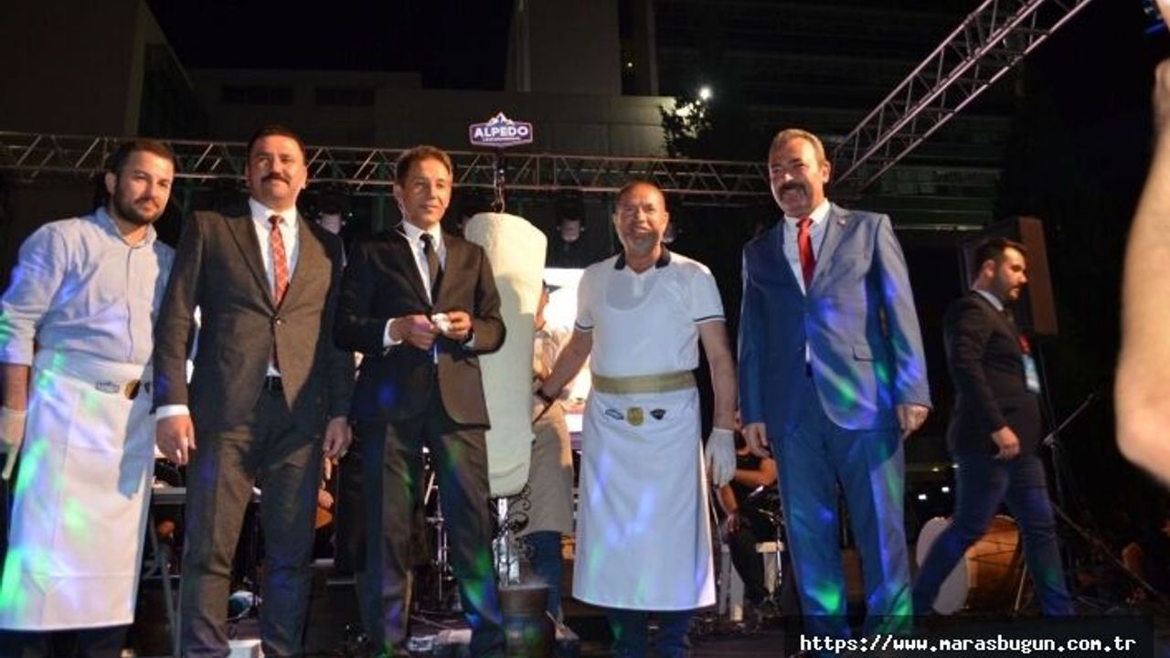 Programda çengelle asılan alpedo Maraş dondurmasını Mustafa Yıldızdoğan, balta ile keserken, Yıldızdoğan’a satırla alpedo- kervan lezzet grubu yönetim kurulu başkanı Sami Kervancıoğlu eşlik etti.