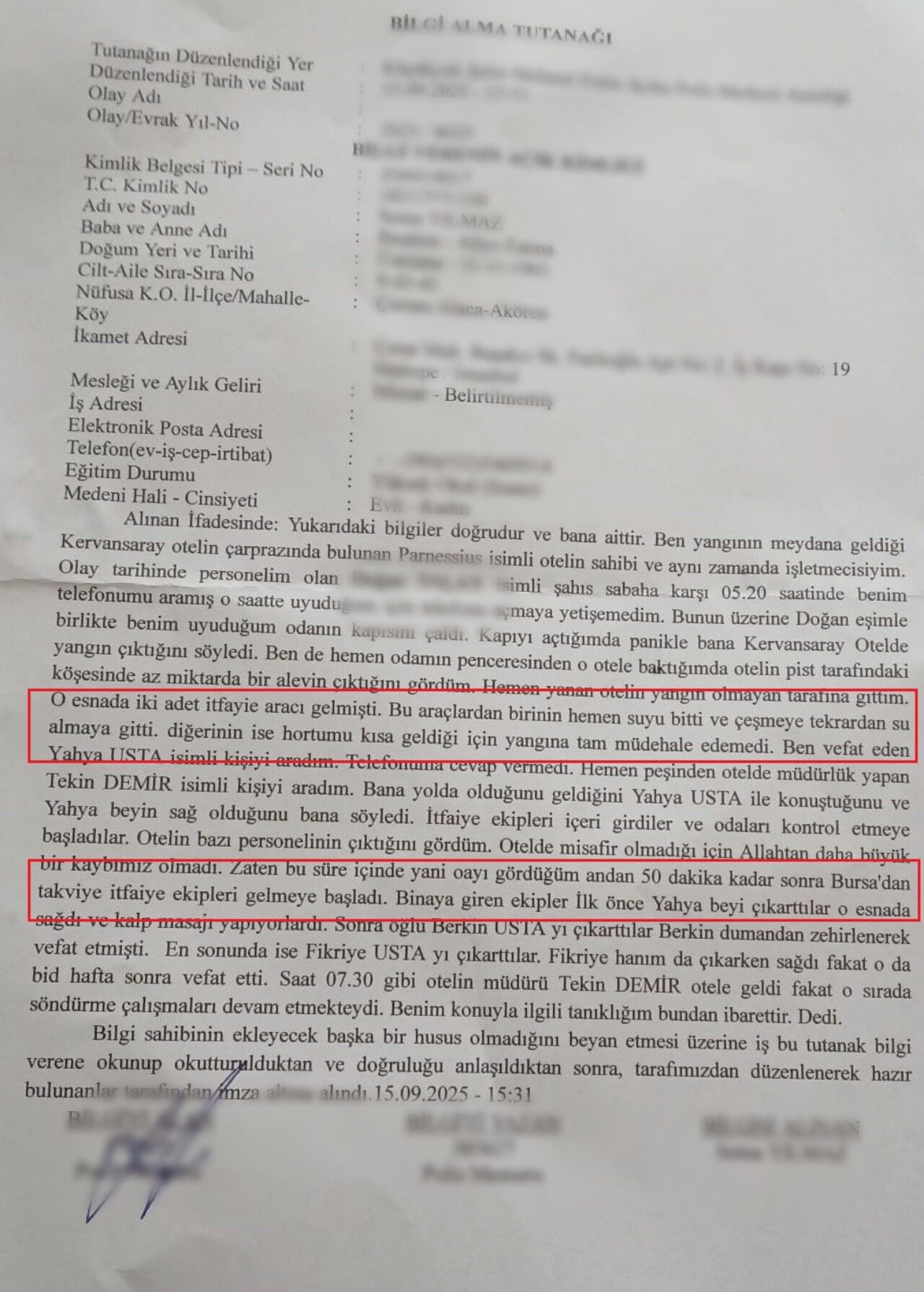 Olayın tanıklarından S.Y.’nin emniyetteki ifadesi ise iddiaları destekler nitelikte. S.Y., yangının ilk anlarında sadece otelin bir köşesinde küçük bir alev gördüğünü belirterek şu ifadeleri kullandı: "İki itfaiye aracı geldi. Birinin suyu anında bitti ve çeşmeye su almaya gitti. Diğerinin ise hortumu kısa olduğu için yangına ulaşamadı. Bursa'dan takviye ekipler gelene kadar yaklaşık 50 dakika geçti. Bu sürede yangın şiddetlendi. Ekipler içeri girdiğinde önce Yahya Bey'i çıkardılar, sağdı ama sonra hayatını kaybetti."