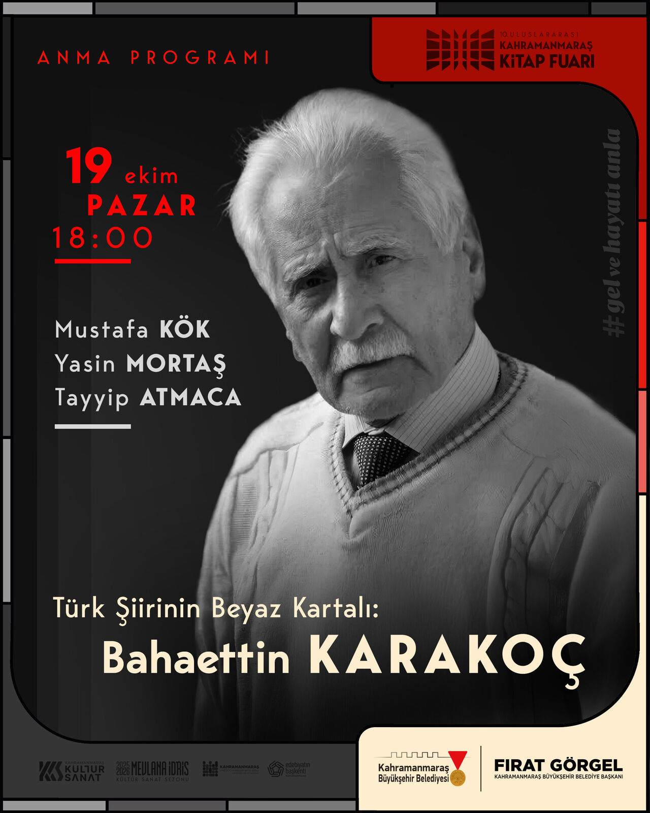 Kahramanmaraş Büyükşehir Belediyesi’nden yapılan açıklamada, kültür ve sanat faaliyetlerinin kesintisiz sürdürüldüğü vurgulanarak, “Şehrimizin yetiştirdiği kıymetli şair ve edebiyatçı Bahaettin Karakoç’u vefatının yıl dönümünde rahmetle ve minnetle anıyoruz. Edebiyatımıza kazandırdığı değerleri hatırlamak, gelecek kuşaklara aktarmak için tüm hemşehrilerimizi bu özel programa davet ediyoruz” denildi.