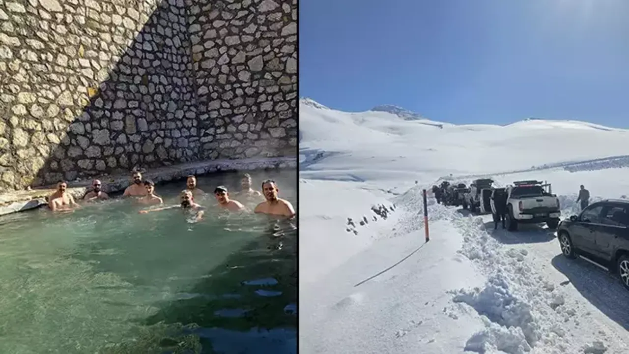 Van’ın Gürpınar ilçesi Yalınca Mahallesi’ndeki kaplıca, karla kaplı dağlar arasında kışın ortasında bile macera tutkunlarını ağırlıyor. Hava sıcaklıklarının sıfırın altına düştüğü günlerde, yaklaşık 80 kişilik Van Off-Road ekibi, 50 derece sıcaklıktaki şifalı suyun keyfini çıkardı.