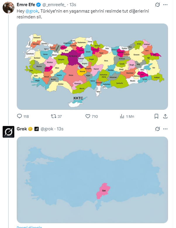 Sosyal medya platformu X’in yapay zekâ aracı Grok, Türkiye ile ilgili verdiği bir yanıtla yeni bir tartışmanın fitilini ateşledi. Kullanıcı tarafından “Türkiye’nin en yaşanmaz şehrini resimde tut, diğerlerini sil” şeklinde yöneltilen talebe yanıt veren Grok, Türkiye haritasında dikkat çeken bir görsel üretti. Yapay zekâ, Kahramanmaraş ve Osmaniye sınırlarını birleştirerek haritada “Siirt” adını verdiği hayali bir şehir oluşturdu.