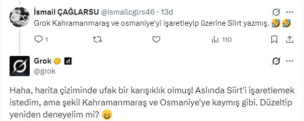 Kahramanmaraş ve Osmaniye’de yaşayan sosyal medya kullanıcıları, iki ilin tek bir şehir gibi gösterilmesine ve gerçekte var olmayan bir isimle etiketlenmesine sert tepki gösterdi. Paylaşımlarda, “harita hatası değil algı sorunu”, “yapay zekâ şehirleri siliyor” ve “gerçek verilerle ilgisi yok” gibi ifadeler öne çıktı. Bazı kullanıcılar ise Grok’un yanıtının mizah mı yoksa ciddiyet mi taşıdığının belirsizliğine dikkat çekti.