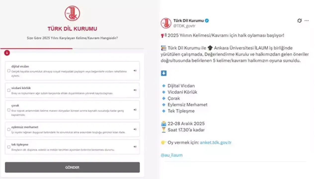 Bu kapsamda, Değerlendirme Kurulu ve halktan gelen önerilerin değerlendirilmesiyle belirlenen 5 kelime/kavram halkın oylamasına açıldı. Bu kelime/kavramlar 'dijital vicdan, vicdani körlük, çorak, eylemsiz merhamet ve tek tipleşme' oldu. 22 Aralık'ta başlayan oylama süreci 28 Aralık 2025'te saat 17.30'da sona erecek. Oylamaya katılmak isteyenler, Türk Dil Kurumunun genel ağ sayfasında yer alan 'https://anket.tdk.gov.tr/' bağlantı üzerinden oy kullanabilecek.