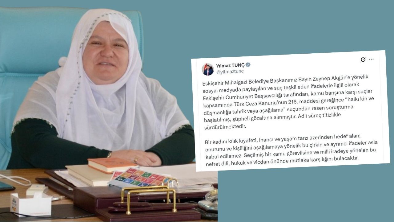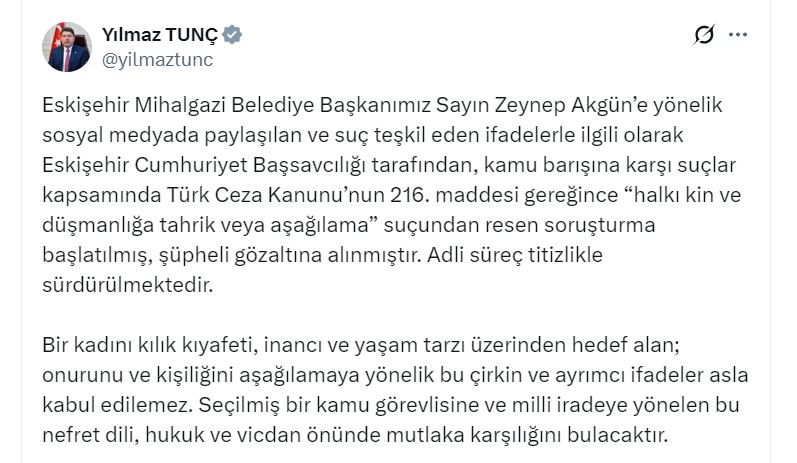 Adalet Bakanı Yılmaz Tunç, Eskişehir’in Mihalgazi ilçesi Belediye Başkanı Zeynep Akgün hakkında sosyal medyada yapılan hakaret içerikli paylaşımla ilgili Eskişehir Cumhuriyet Başsavcılığı tarafından resen soruşturma başlatıldığını duyurdu. TCK’nın 216’ncı maddesi kapsamında yürütülen soruşturma doğrultusunda şüpheli gözaltına alındı.